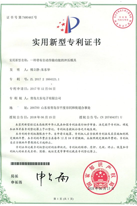 青島大東標(biāo)牌-實(shí)用新型專利證書